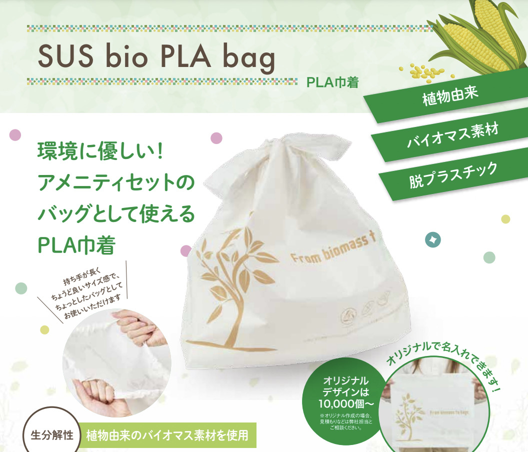 アメニティセットのバッグとして使えるPLA巾着。表面には、バイオマス素材・プラスチック削減・カーボンニュートラルのマークがあり、簡単にエコが訴求できます。持ち手をお好みのサイズで調整できるため使い心地抜群です。