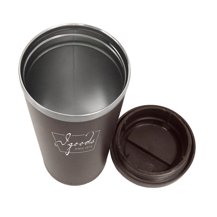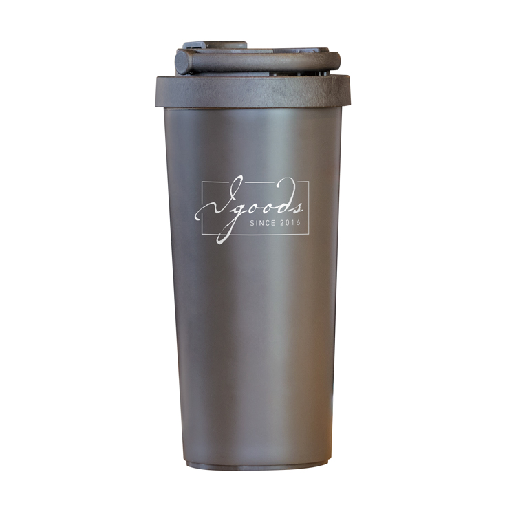 蓋に廃棄予定のコーヒー粉を再利用したエコなサーモタンブラー。容量480mlで取っ手付きのフタが持ち運びに便利です。真空断熱の二重構造で一年中保温・保冷ができます。シックな色合いで名入れ対応も可能です。