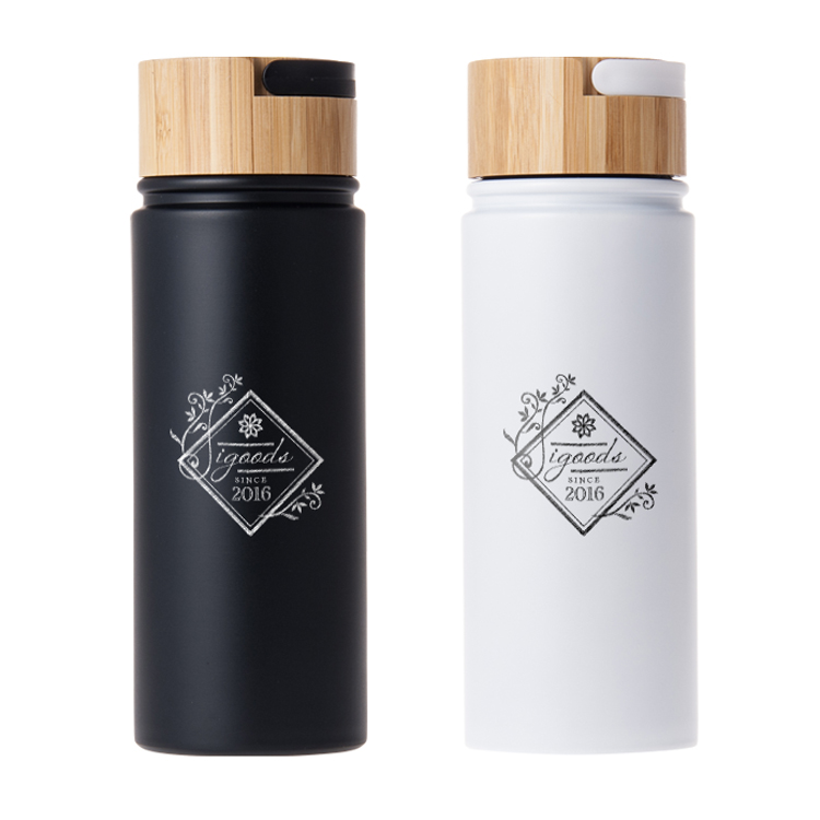 蓋に天然竹素材を使ったナチュラルな風合いのステンレスボトル。保冷・保温機能で飲み物の温度を長時間保てます。全面印刷でオリジナルデザインが可能で、販促用やギフトに最適です。