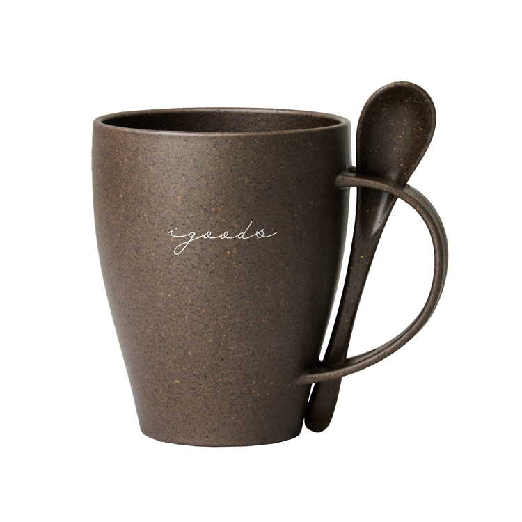 植物由来のPLA素材を使用したマグカップ。取っ手には穴が空いており、お持ちのスプーンを収納できます。名入れも可能なため、オリジナルグッズとしての展開もおすすめです。