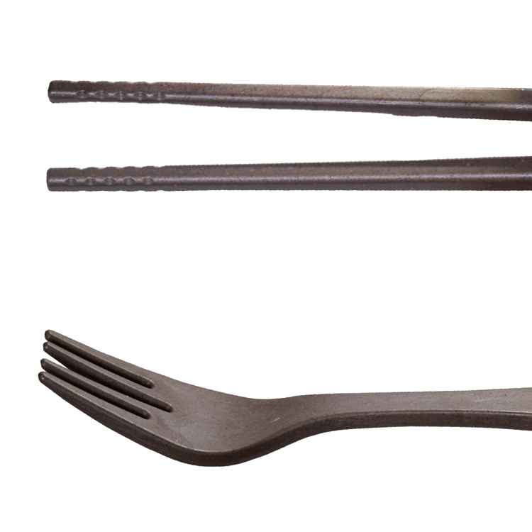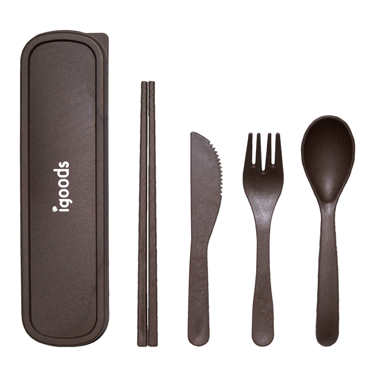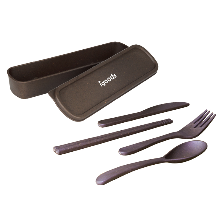 植物由来のPLA素材に廃棄予定のコーヒー粉を練り込んだ、エコなカトラリーセット。スプーン・フォーク・ナイフ・お箸が揃い、専用ケースに収納できます。ロゴ印刷も対応可能で、エコを意識したノベルティ展開におすすめです。