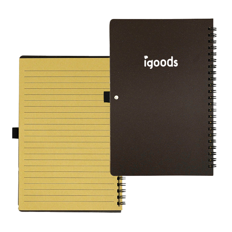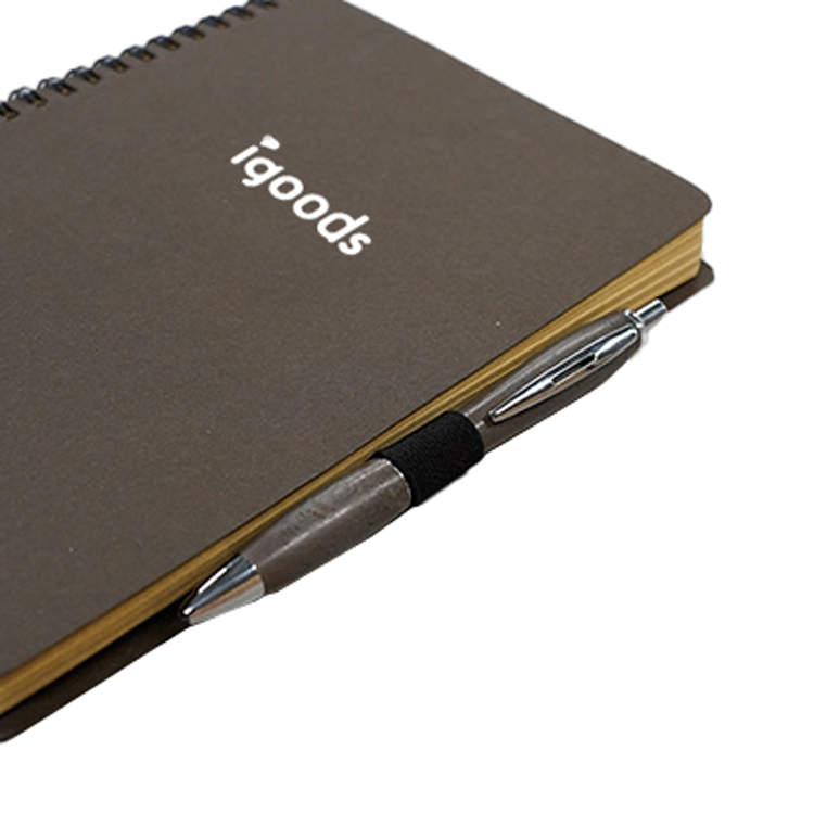 廃棄予定のコーヒー粉を約5〜10%再利用した、環境にやさしいリングノート。マットな質感と温かみのあるデザインが魅力です。ペンを収納できるゴムバンド付きで、使い勝手もよいです。表紙には名入れもできます。