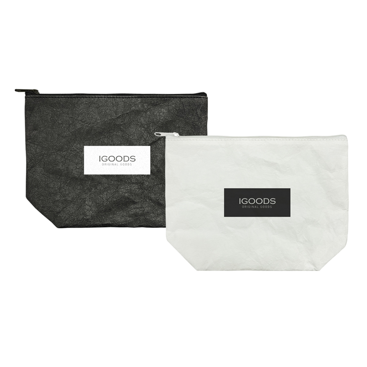 植物由来セルロース素材の水洗い可能なペーパーポーチ。文具やコスメの収納に便利な横24cm×縦17cmサイズで使い勝手がよいです。ロゴ印刷も可能でノベルティにおすすめです。