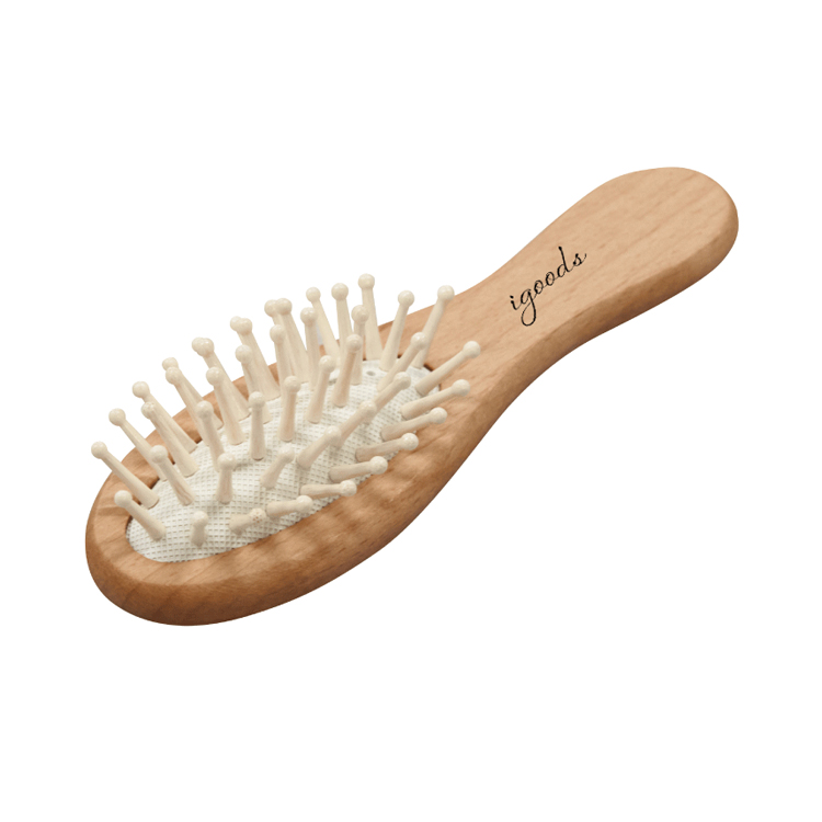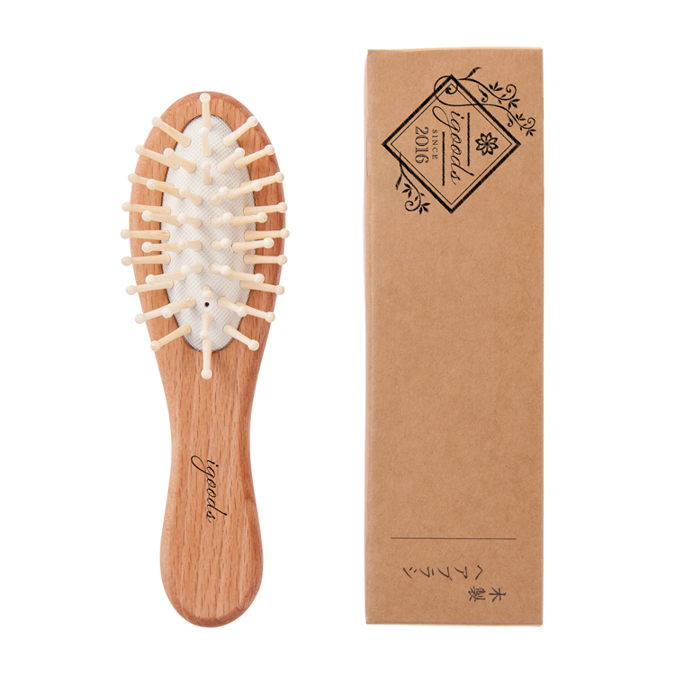 国産間伐材と竹製櫛歯の木製ヘアブラシ。自然の温もりと優しい手触りで、静電気を抑え髪に優しい設計です。耐久性も高く、ロゴ印刷可能でノベルティやギフトにおすすめです。