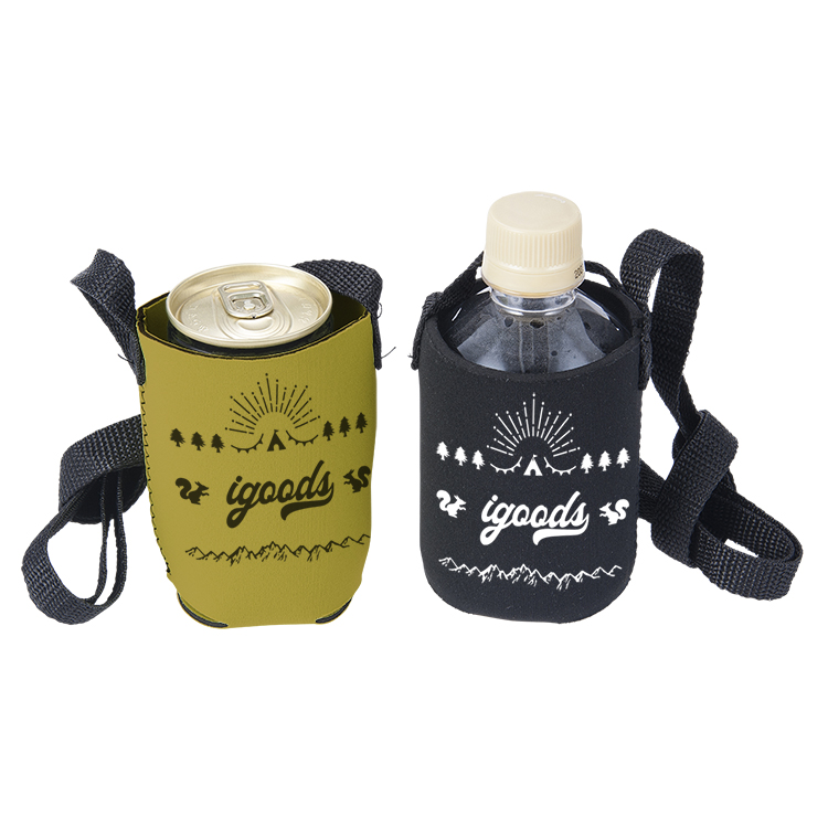 首や肩にかけて持ち運びできるドリンクホルダー。キャンプやスポーツ観戦、フェスなどで活躍。下部にマチがついており、安定して持ち運びいただけます。販促ノベルティやイベントの来場特典として人気です。